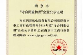 2017年12月29日,接到南京市企業(yè)信用管理協(xié)會通知,潤邦公司再次通過2016年度市級“守合同重信用”企業(yè)的認定。誠信潤邦,傾心服務(wù)。潤邦始終把合同管理、信用